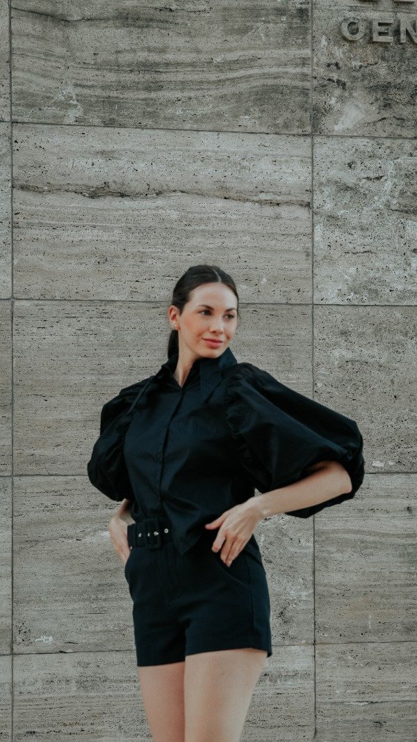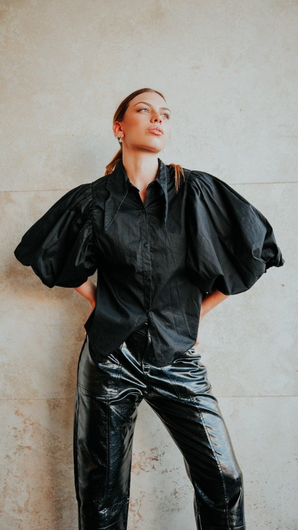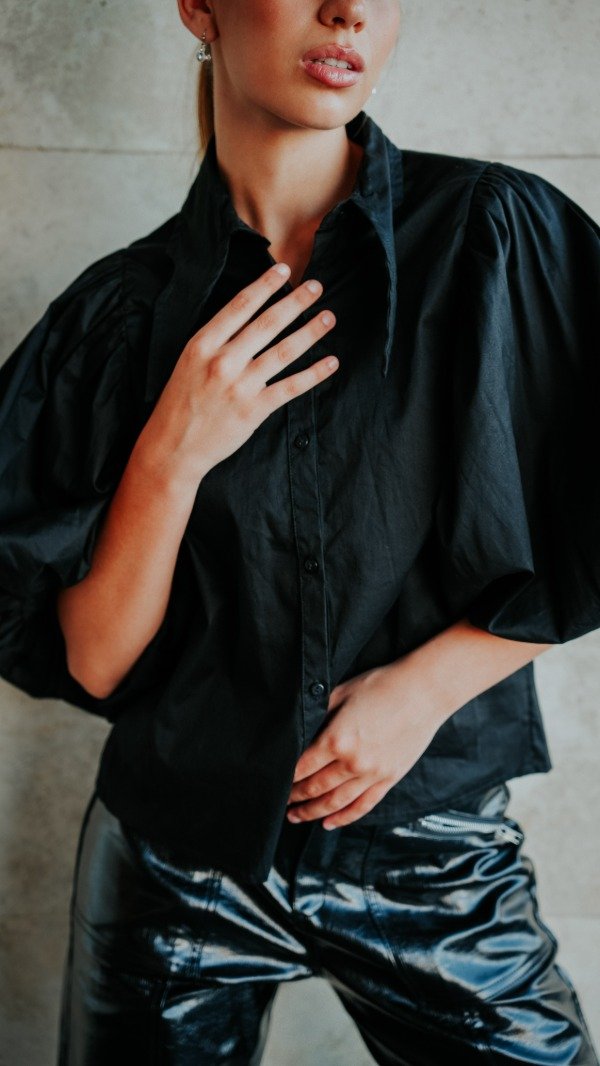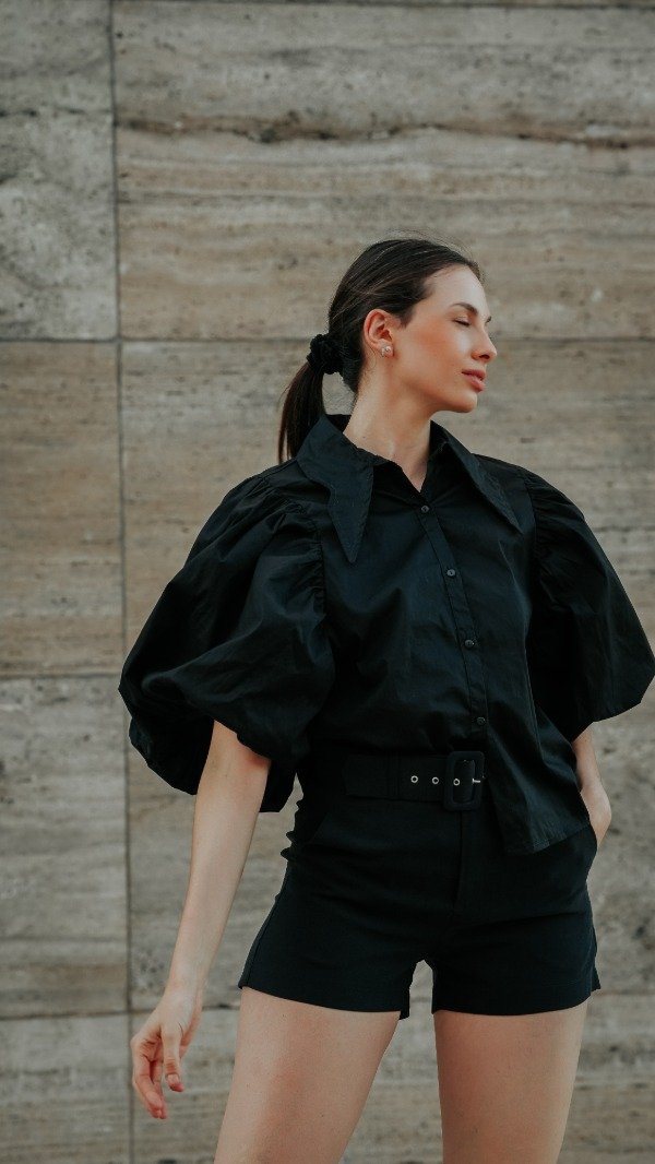 Camisa de poplín con mangas bullón y cuello asimétrico. Corte fit moderno.