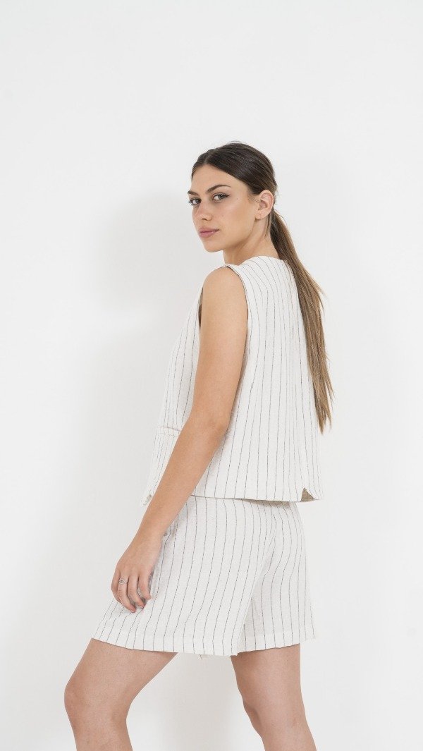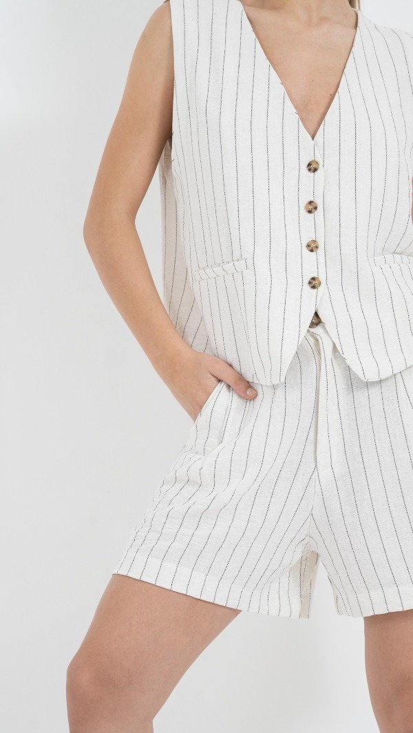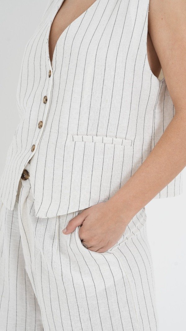 El set Amalfi combina la frescura del lino con la estructura de la sastrería. Confeccionado en lino rayado, forrado íntegramente en tafeta a tono para un acabado prolijo y confortable.