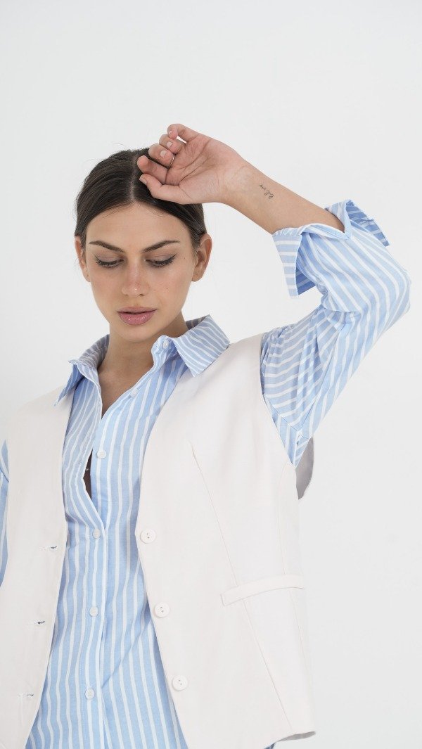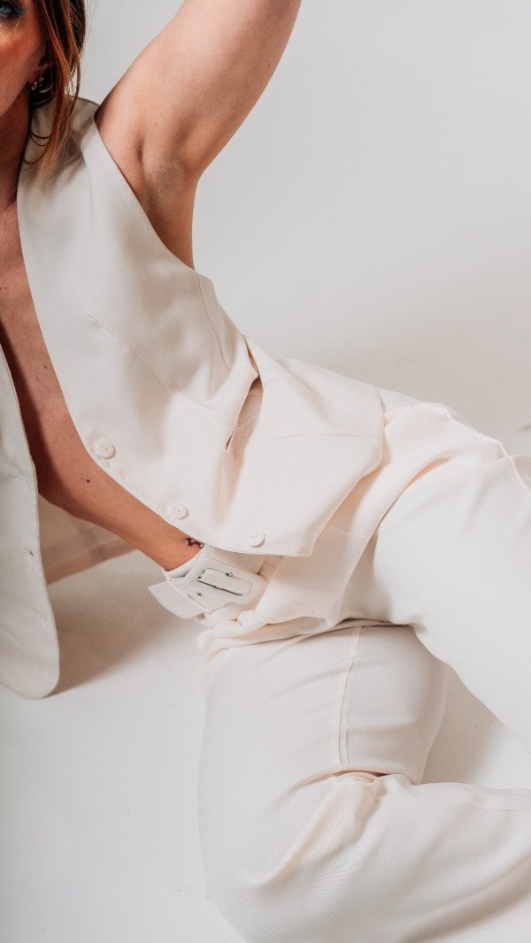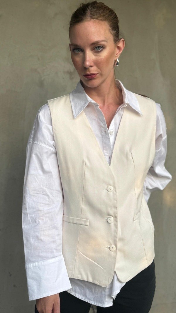 Chaleco sastrero con pinzas y estructura impecable, totalmente forrado en su interior.