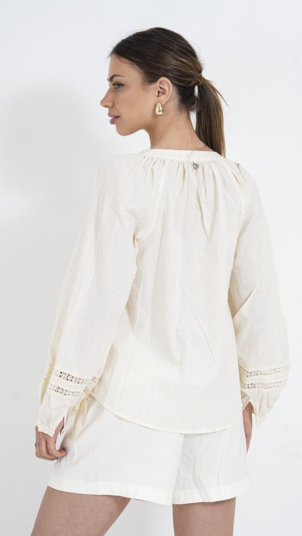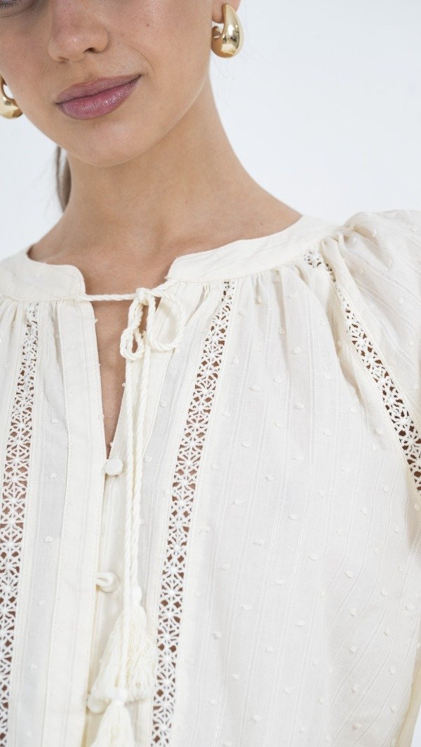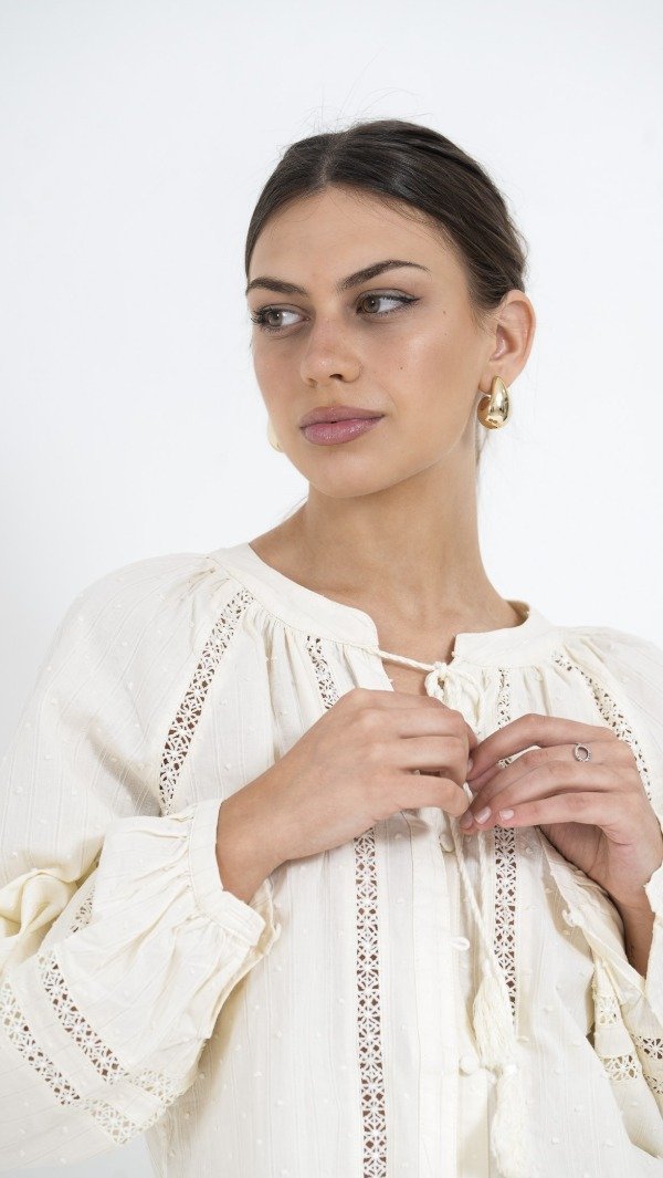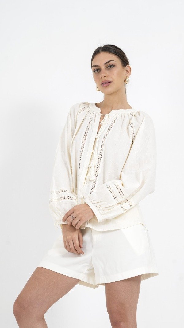 Blusa de roderie con finas rayas plateadas, que aportan brillo sutil y elegancia. Cordón delantero para atar o dejar suelto, adaptándose a tu look. Botones forrados que completan un acabado impecable y premium.
