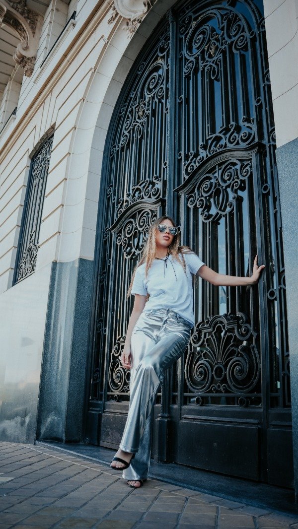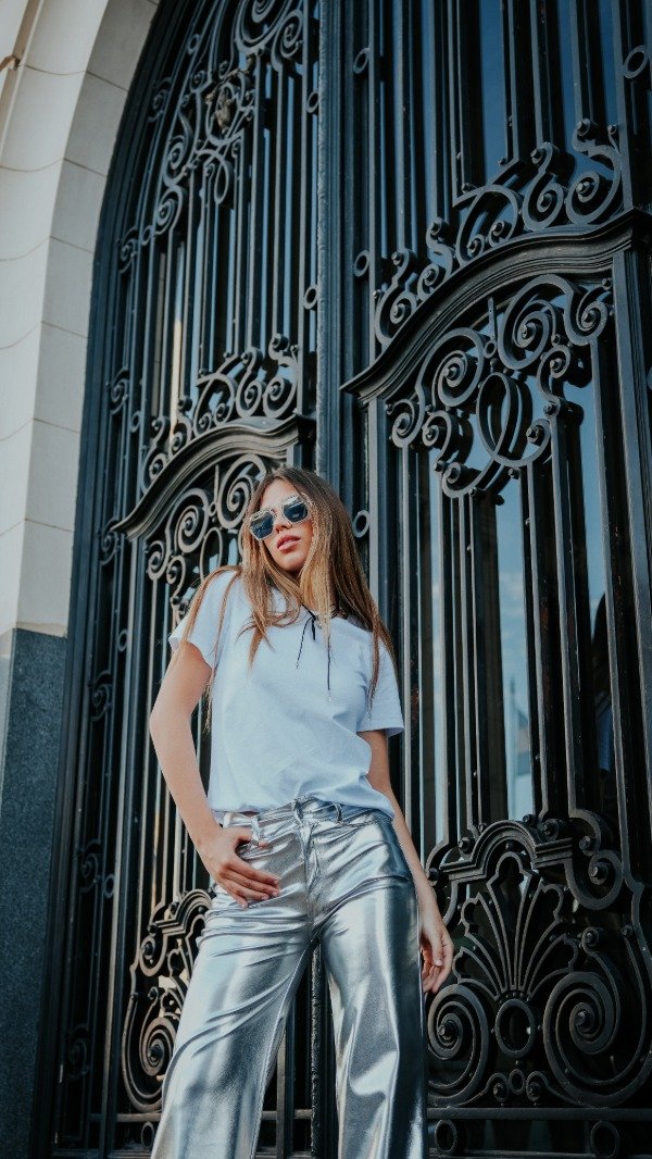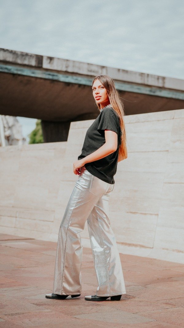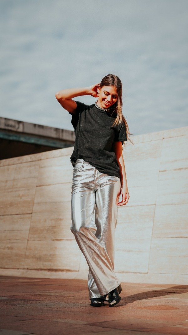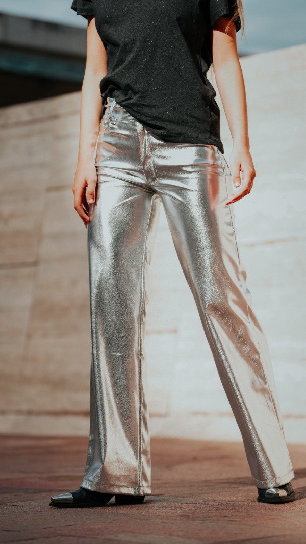 Pantalón metalizado color plata con corte oxford. Su tejido elastizado se adapta al cuerpo realzando la silueta, aportando comodidad y estilo. Una prenda versátil y sofisticada para elevar cualquier look, de día o de noche.